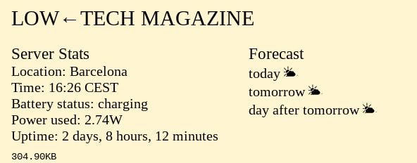 I think there’s something similar going on with the brilliant work happening at Low-Tech Magazine. From their unique use of solar power (described below) to the printed version of their website that they have available, Low-Tech Magazine is exploring the interface between the digital, which can often feel ethereal and unmoored from reality, and the analog, which encounters the constraints of such earthly obstacles as clouds blocking the sun. For this website, this constraint is literally a threat because the server for LTM is powered by a single solar panel in Barcelona. If the sun disappears for extended periods, the website can go down! The website is worth visiting if nothing else for the server stats it lists in the footer.